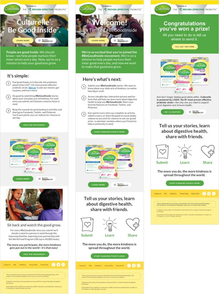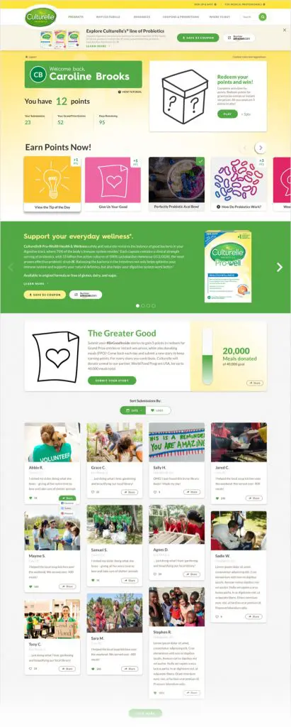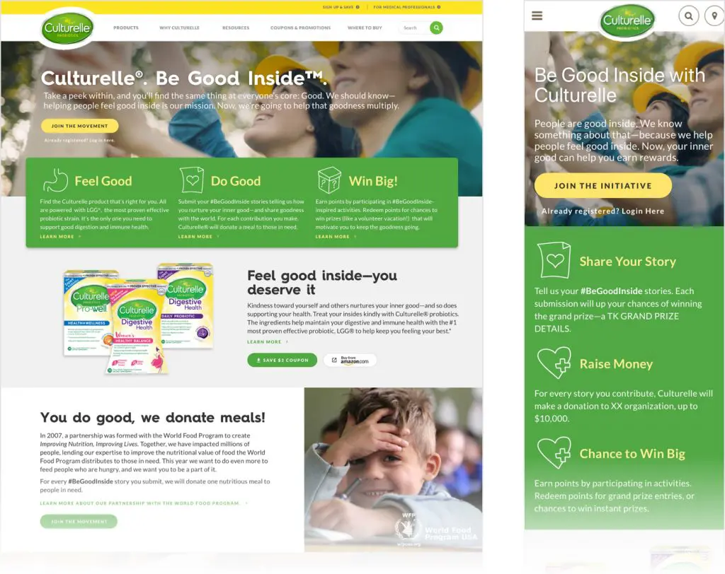 This site contained watching videos, reading tips, interacting with content, taking quizzes, and stories written by the community in a social feed. User’s completed these activities and earned points to redeem chances to win prizes and entries to a grand prize. For every point users earned, Culturelle donated a meal to a charity with a goal number in sight. I designed the microsite, emails and banner ads.